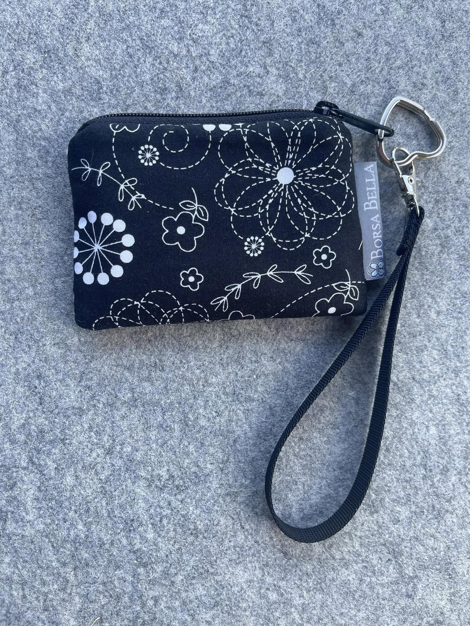 Pixy Roo Card or Coin Holder Catch All Zippered Pouch A1 - Black and White Daisy Fabric